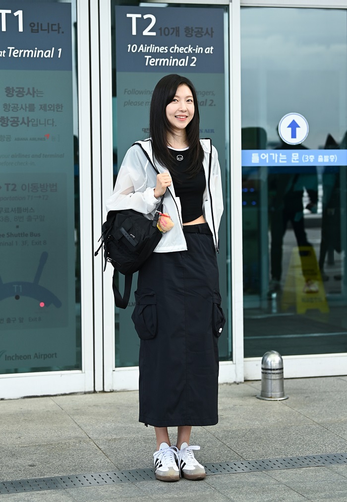 출국에 앞서 주현영은 하이드로겐(HYDROGEN)의 블랙 컬러 크롭 티셔츠와 카고 스커트를 착용한 뒤 화이트 색상의 초경량 바람막이를 착용해 여름 시즌까지 활용하기 좋은 꾸안꾸 공항패션을 선보였다. 여기에 블랙 컬러의 백팩과 깔끔한 화이트 스니커즈를 더해 캐주얼한 무드를 가미시켰다.