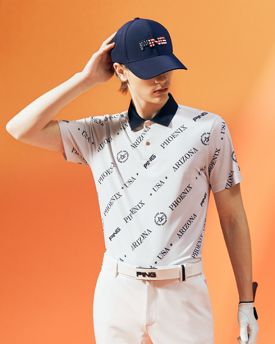모델은 핑의 에센셜 라인인 ‘아리조나 컬렉션’의 로고 패턴 폴로 티셔츠와 화이트 팬츠를 매치해 세련되고 시원한 화이트룩 스타일링을 완성했다.