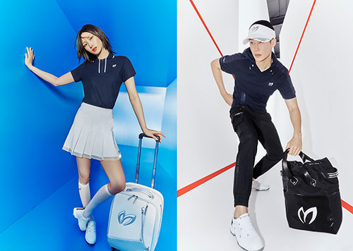 남자 모델은 필드와 일상에서 고루 입기 좋은 심플한 네이비룩을 연출했다. 상의는 캐주얼한 분위기의 후드 반팔 니트로 소재 블로킹 디자인과 로고 포인트가 돋보인다.